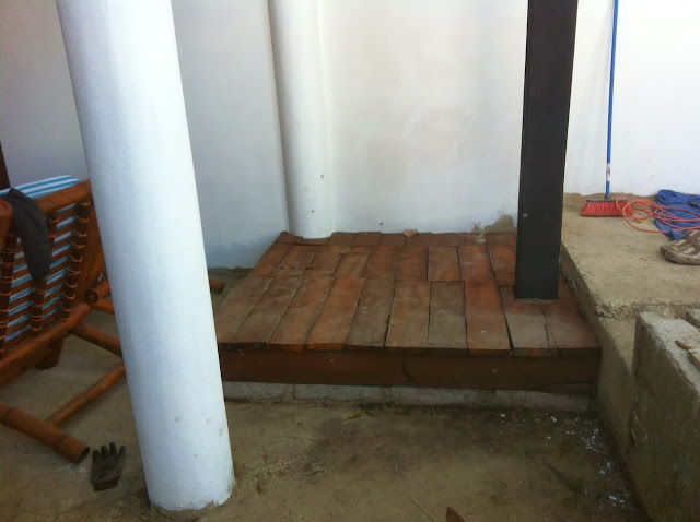 The old roof beams that I had cut up into planks last month have been amazing. Not only has it saved me money but the mahogany looks great and of course it is very strong. I needed a decking built over my water shut offs and clean outs so he threw this together one afternoon. It still needs sanding and finishing but it looks great.